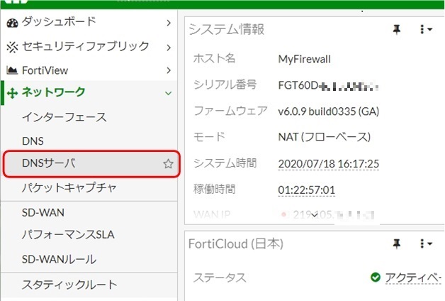 ネットワーク のメニュー内に、DNSサーバ の項目があるか確認